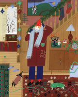 This painting celebrates the joys of a handmade Christmas and the simple pleasure of going for a walk on a crisp winter's day. With eager dogs waiting by the door, tails wagging in anticipation, there's a special delight in wrapping yourself in layers of warmth—scarves, mittens, and woolen hats—before stepping out into the glistening snow. The ritual of bundling up becomes part of the adventure itself, a momentary pause between the cozy indoors and the invigorating winter landscape that awaits you and your four-legged companions.